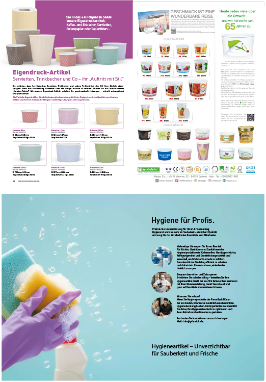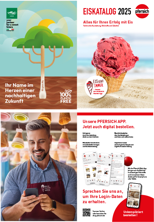 So entstand ein übersichtlicher, visuell ansprechender Katalog, der Pfersich als starken Partner für handwerkliche Eismacher präsentiert – von den Rohstoffen bis zur Ladeneinrichtung. Klar gegliedert, leicht navigierbar und mit einem Bild-Text-Verhältnis, das Lust auf die Produkte macht und gleichzeitig Orientierung bietet.